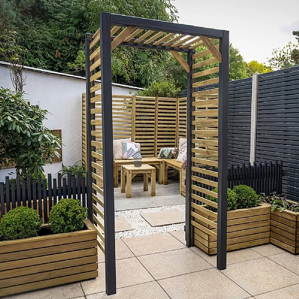 - The contemporary Slatted Garden Arch from Forest Garden is ideal for your modern garden design.