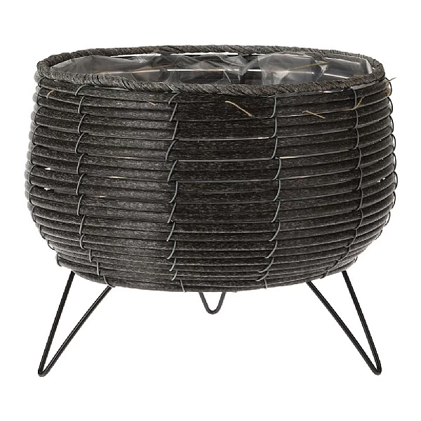 - Bohemian style woven basket planter with braided rim and contemporary metal legs